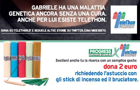 Dall’8 dicembre i clienti Progress potranno donare 2 euro a Telethon ricevendo in regalo uno stick di incenso ed un bruciatore.