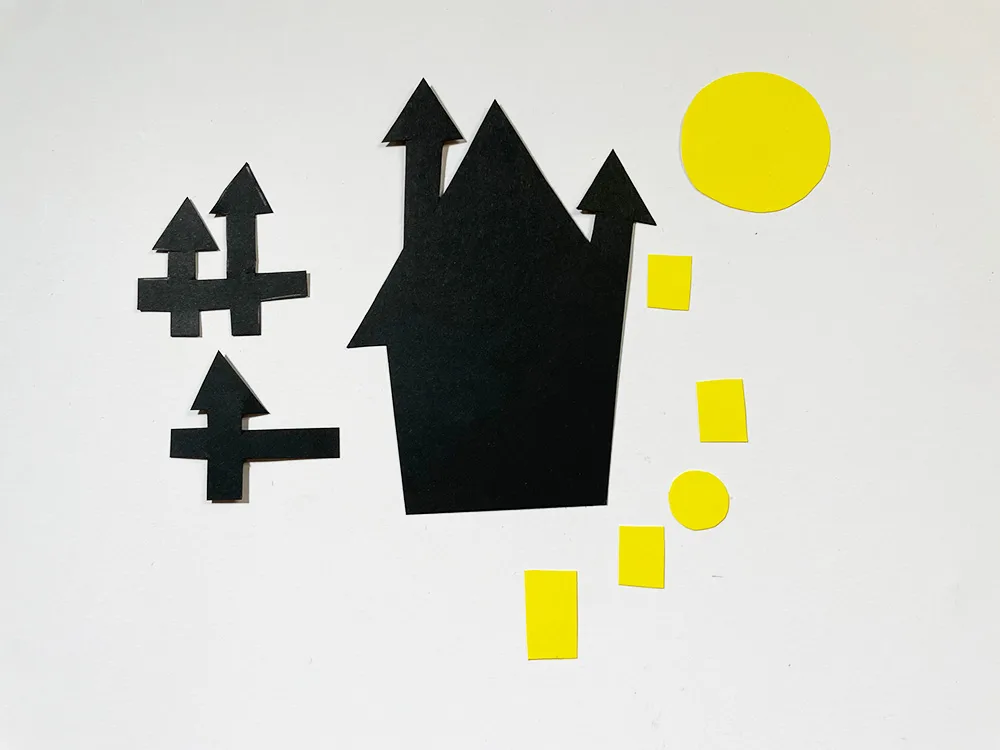 Con il cartoncino giallo invece abbiamo realizzato la luna, la porta e le finestre del castello. In questo caso tutto è molto semplice, anche le forme e le misure potete stabilire sulla base del vostro gusto. Una volta disegnate e ritagliate porte e finestre le potremo incollare sul nostro castello.