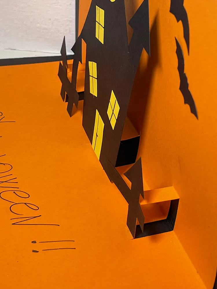 Per concludere non ci resta che incollare il nostro biglietto arancione sul foglio di cartoncino nero, che avremo debitamente piegato a metà. Questo serve a nascondere i buchi che si sono inevitabilmente creati nel cartoncino arancione quando abbiamo realizzato le linguette.