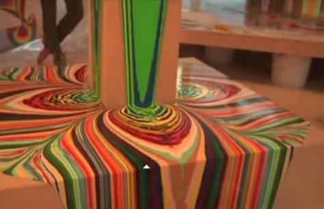 L’opera si chiama Tall Painting, che letteralmente significa “pittura dall’alto”: l’artista versa vernice di diversi colori su un supporto di legno lasciandola scivolare liberamente sulle pareti del supporto fino a raggiungere e allargarsi sul pavimento.
