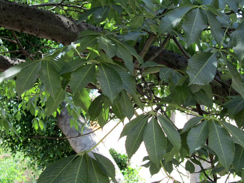 Le foglie della Chorisia Speciosa hanno un colore verde brillante, sono frastagliate e sono composte da cinque foglioline.