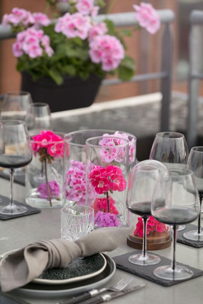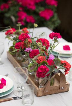 Pensate a delle decorazioni estive per la tavola, veloci e facili da realizzare: raccogliete qualche geranio dai vasi e posizionateli in contenitori in vetro, per esempio bottiglie.
