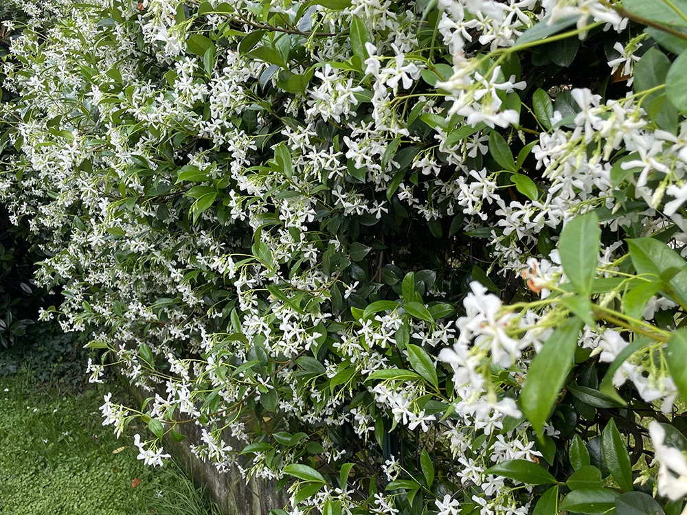 Una possibilità per siepi con i fiori è il Rhyncospermum jasminoides, detto anche Falso Gelsomino: si tratta di un rampicante che richiede una struttura su cui appoggiarsi, ad esempio una rete, un muro o una ringhiera.