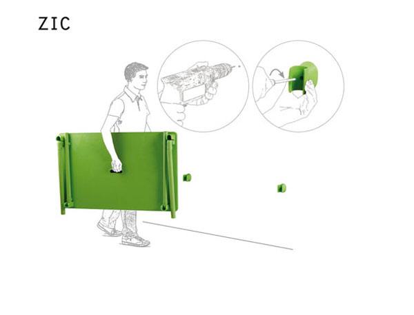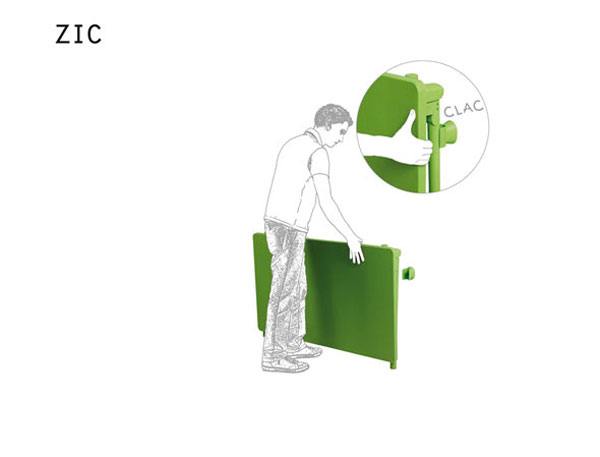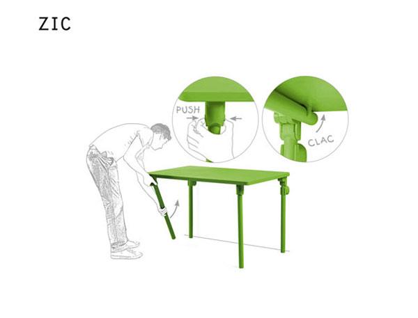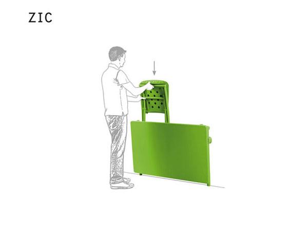 Il tavolo Zic può essere agganciato su un lato ad una parete e grazie ad un semplicissimo meccanismo, richiuso su se stesso risultando parallelo al muro e contenendo al contempo due sedie Zac.