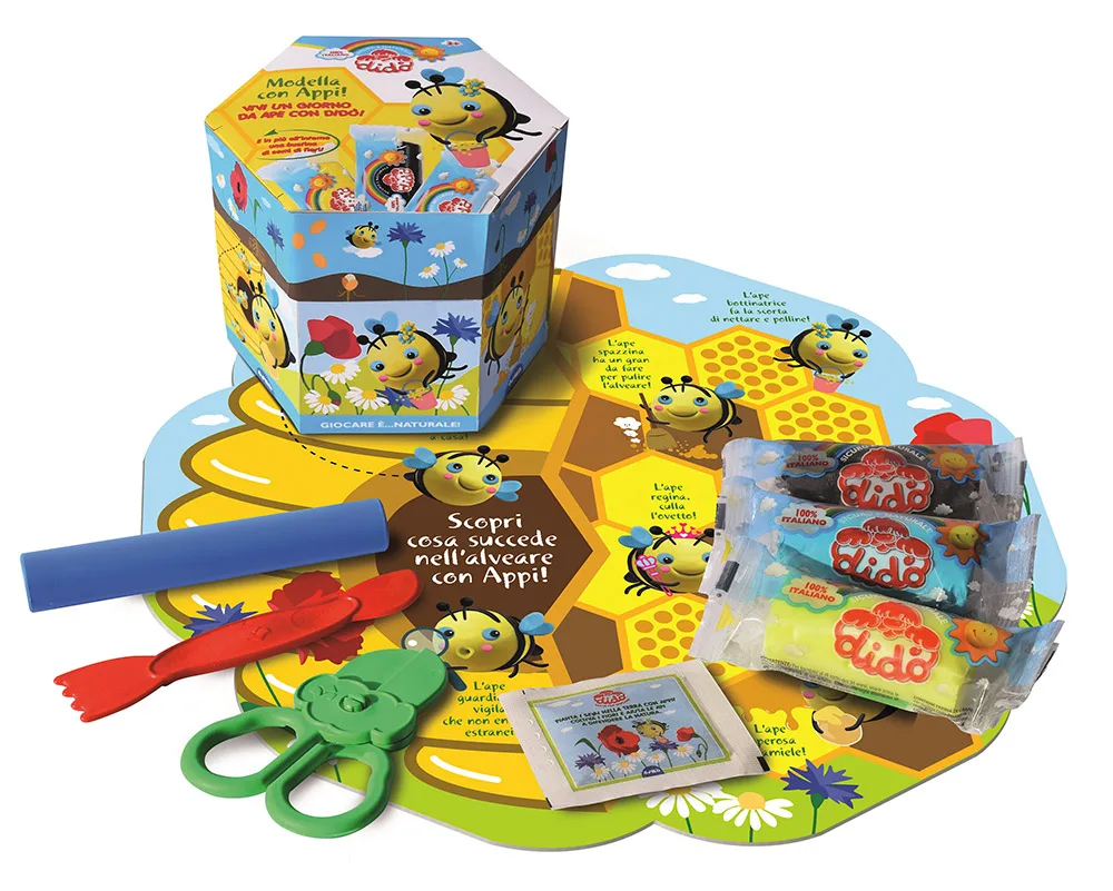 Le api non producono solo miele, ma rendono possibile la vita. Questa speciale confezione di Didò invita bambine e bambini a modellare piccole api con i salsicciotti colorati e gli attrezzi inclusi, scoprendo al tempo stesso, grazie a una tovaglietta illustrata, cosa accade dentro un alveare.