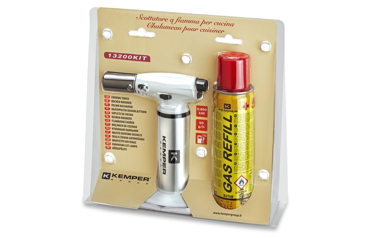 Da regalare o da regalarsi e da usare subito per arricchire il pranzo con gli amici. Si tratta dello scottatore a fiamma 13200Kit della Kemper, ideale per caramellare dolci (la crema catalana è un classico) e per dorare le carni.