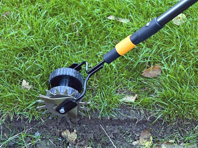 Due tagliabordi, un coltello con raschietto e una scopa da giardino.