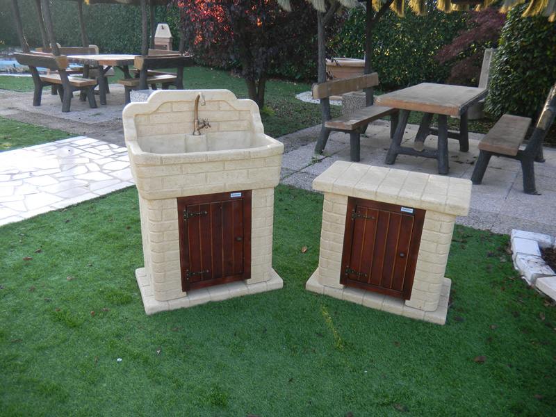 La particolarità dell’acquaio Nonna Matilde e del mobiletto Nonna Priscilla è nella loro completezza estetica, infatti possono indifferentemente essere addossati ad un muro ma anche posizionati al centro del giardino in quanto perfettamente rifiniti anche nella parte posteriore.