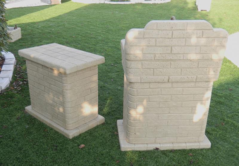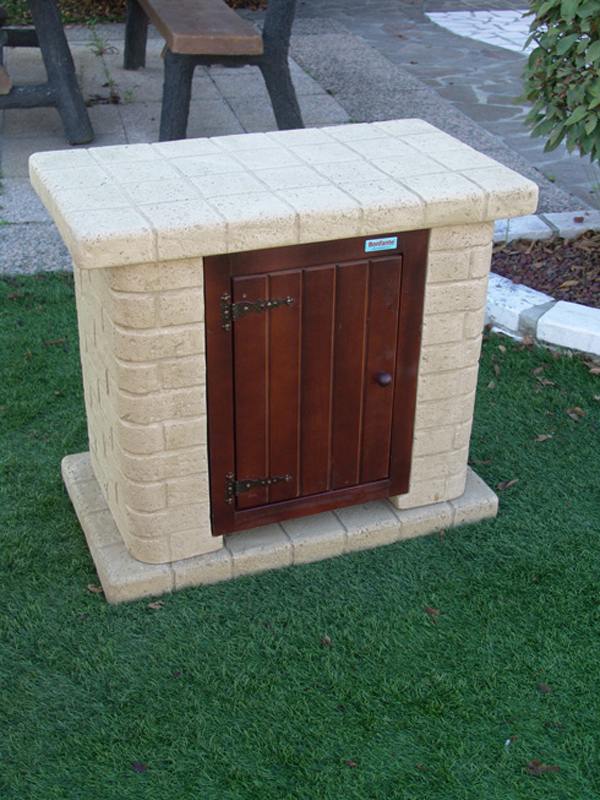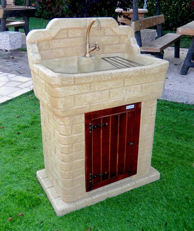 Realizzato in pietra ricostruita con finitura a mattoncini, in color tabacco o tufo, questo acquaio può essere completato con il mobiletto Nonna Priscilla creato da Bonfante per la migliore funzionalità in giardino.