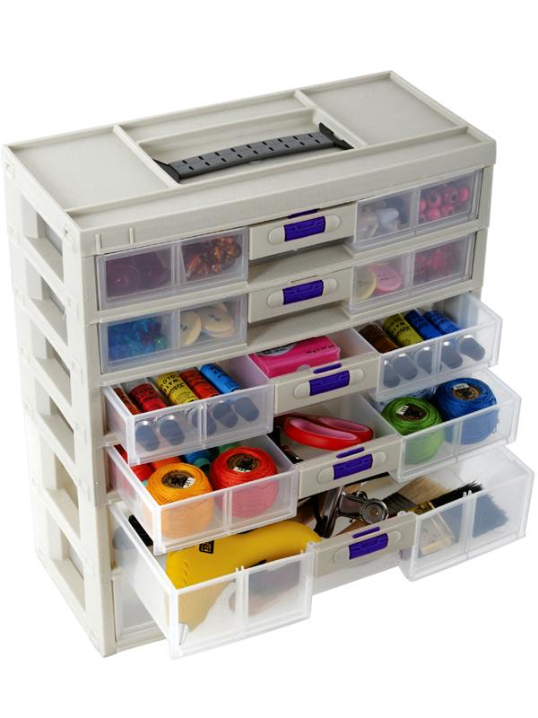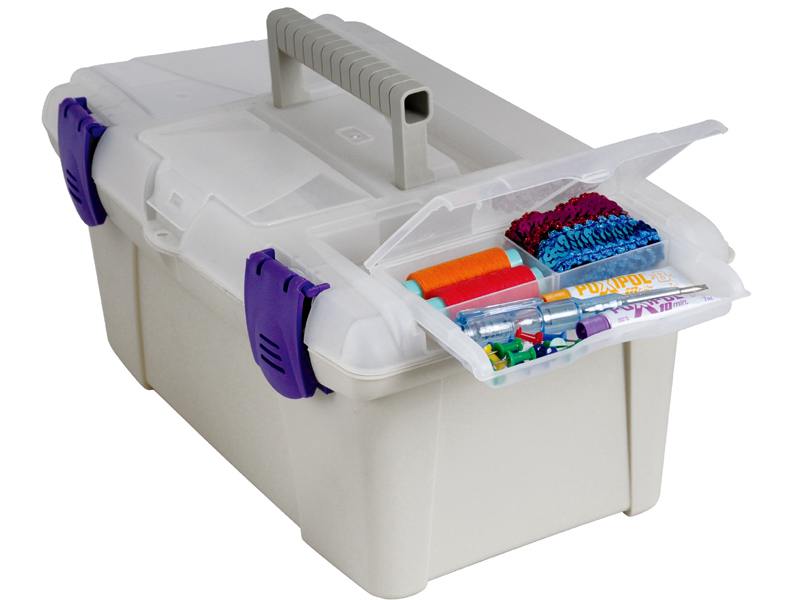La cassetta porta attrezzi da 16’’ con organizers asportabili sembra all’apparenza una normale cassetta porta utensili, ma grazie ai comodissimi alloggiamenti asportabili, si trasforma in comodo set da cucito ricco di scomparti e pratici contenitori separabili.