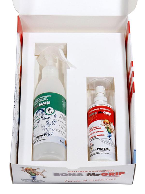 Nella confezione di BonaMrGrip potrete trovare anche un flacone di BonaMain, il prodotto consigliato da Bonasystem per la pulizia delle superfici trattate con BonaMrGrip.