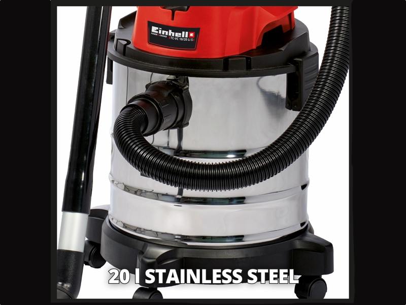Il bidone di questo aspiratore è in acciaio stabile e antiruggine e ha una capacità di 20 l. È molto maneggevole e facile da usare grazie alle 4 rotelle girevoli e a un comodo supporto per accessori integrato all’attacco per soffiatore.