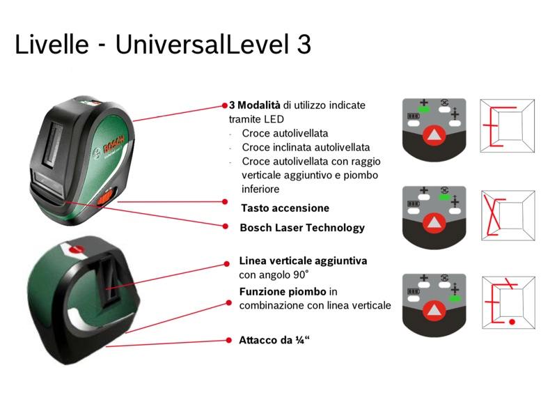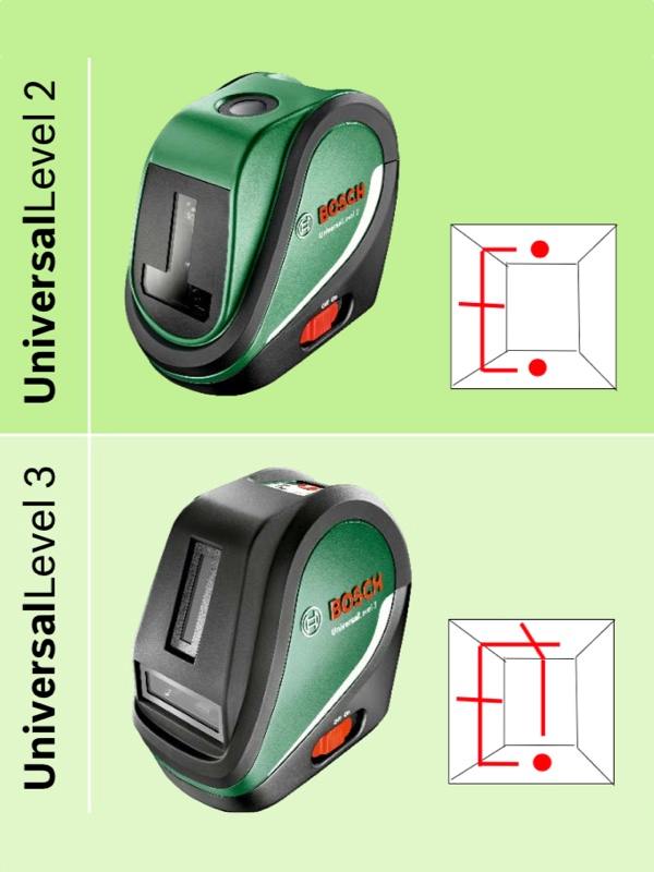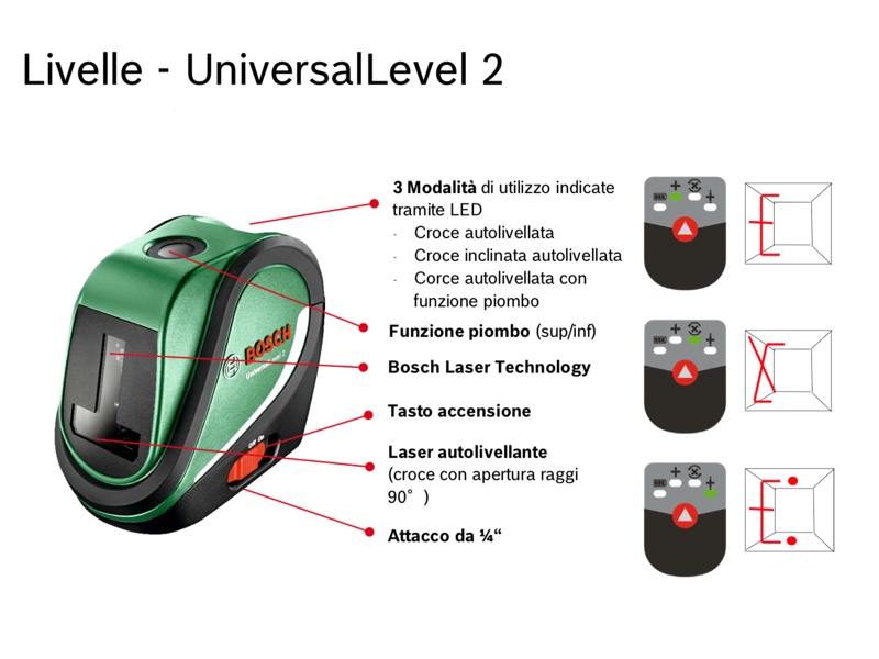 Quelle che vi vogliamo segnalare sono le livelle laser UniversalLevel 2 e UniversalLevel 3 di Bosch. Si tratta di livelle laser di ultima generazione: la UniversalLevel 2 è in grado di proiettare linee laser incrociate con punti a piombo supplementari su soffitto e pavimento, la UniversalLevel 3 invece proietta le linee laser incrociate con una linea verticale supplementare a 90°, oltre naturalmente al punto a piombo su pavimento.