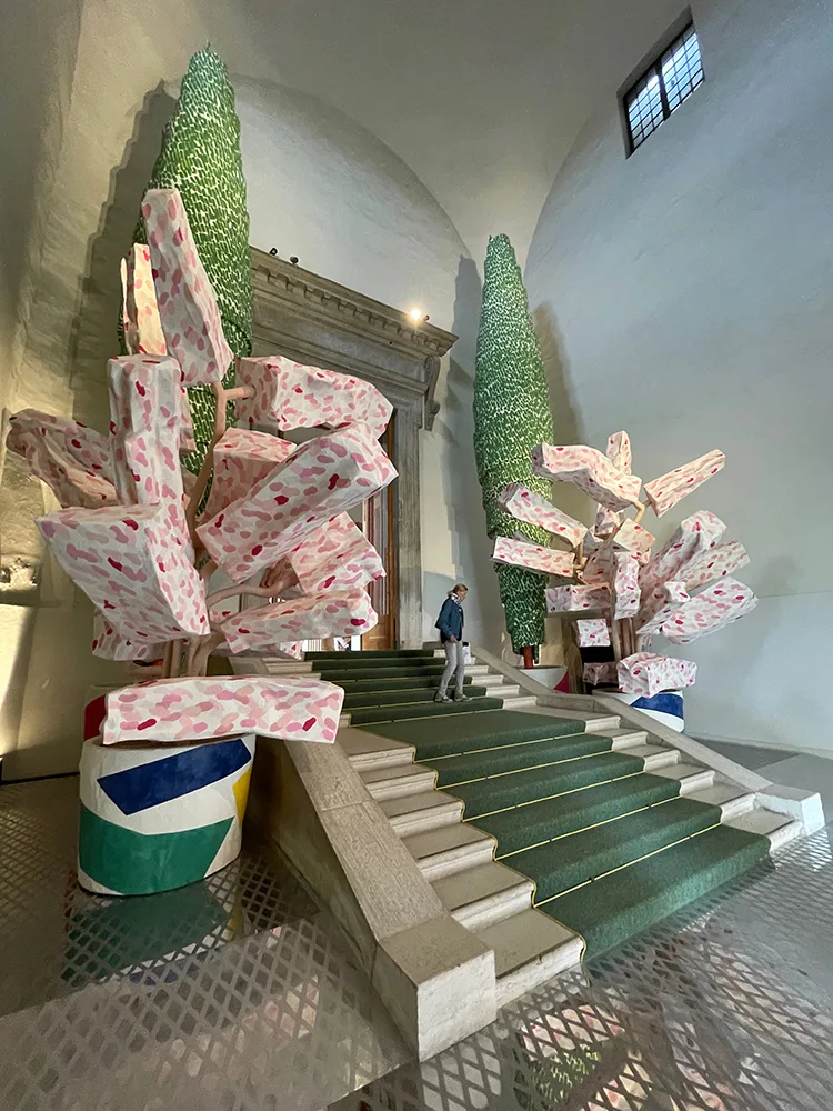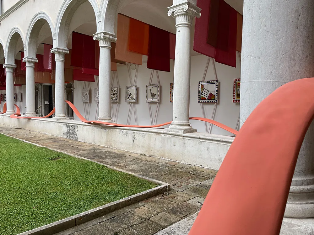 Solo lo spazio della Fondazione Cini, sull’isola di San Giorgio, praticamente di fronte a piazza San Marco, potrebbe valere la visita. Il viaggio nella mostra viene guidato inizialmente da una passerella colorata che si snoda attraverso i giardini e collega ogni spazio espositivo.