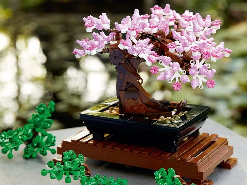 Il Bonsai Tree LEGO invece è costituito da 878 pezzi e può essere costruito con le foglie verdi oppure nel colore rosa dei fiori ciliegio. È fornito con un vaso rettangolare, naturalmente da costruire, e da un supporto LEGO a doghe effetto legno.