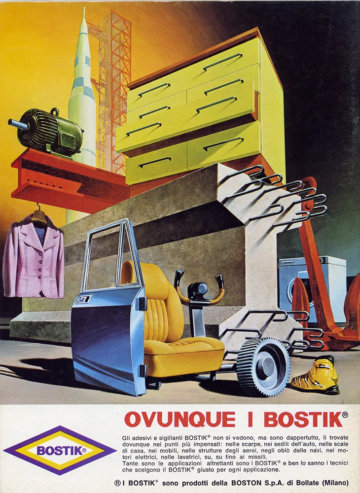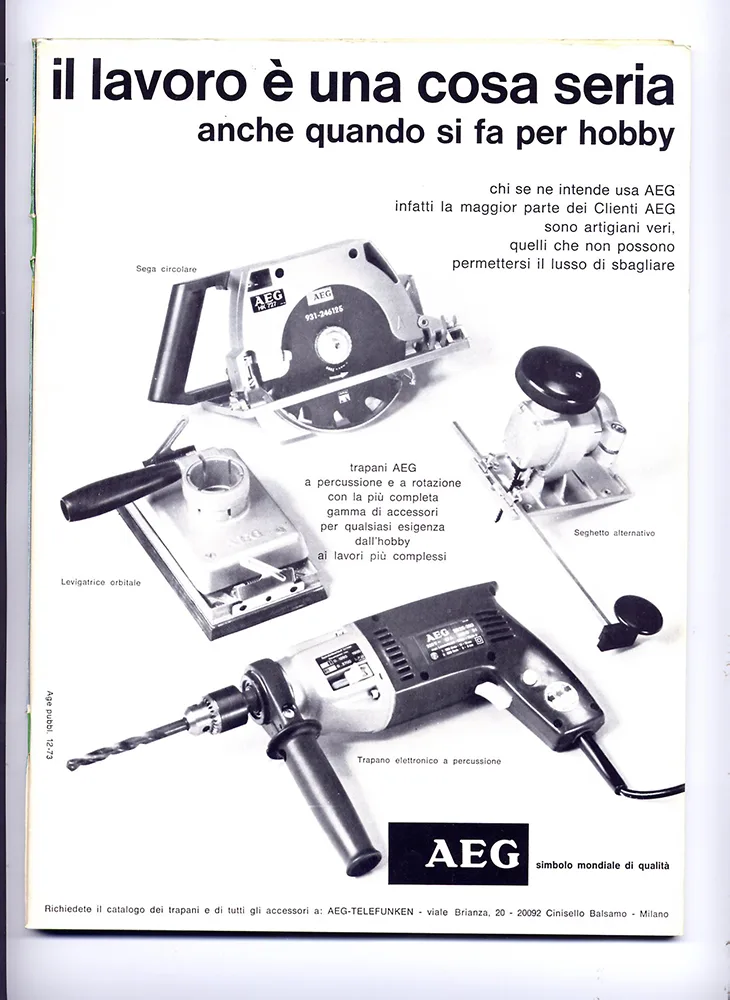 La Stanely con lo slogan “Non sempre che fa da sé fa per tre”, come Bostik, l’adesivo buono “ovunque” fino addirittura alla AEG che annuncia che “Il lavoro è una cosa sera, anche quando lo si fa per hobby”.