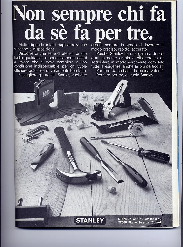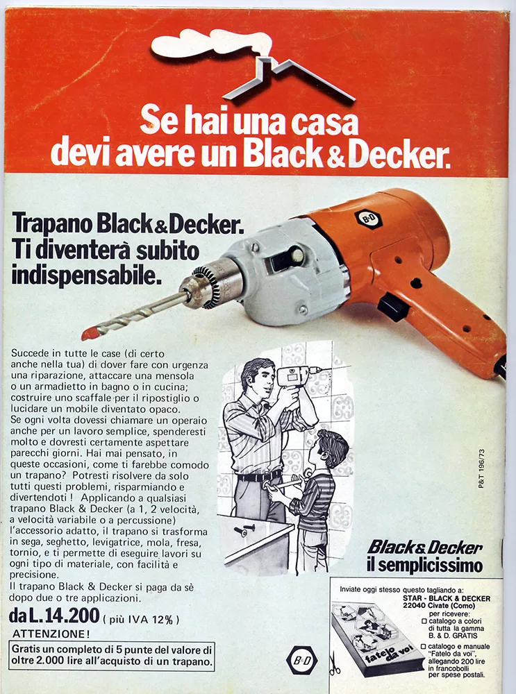 D’altro canto erano anni in cui il cacciavite veniva tramandato di padre in figlio e il trapano lo si chiedeva in prestito al suocero o al vicino.