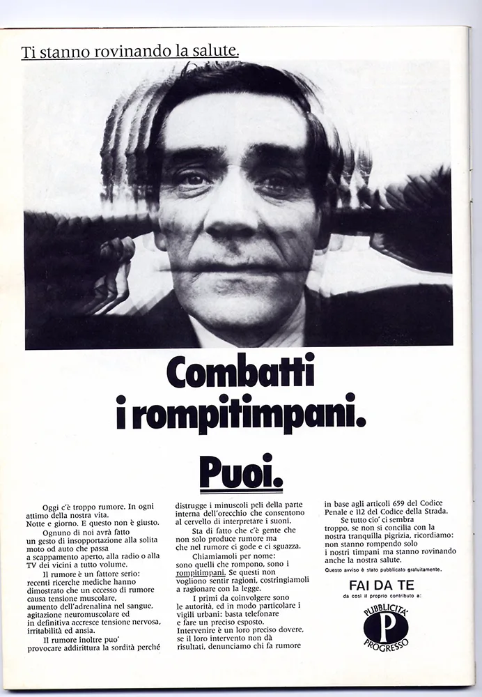 A testimonianza di questo dinamismo verso le attività di bricolage si segnala la campagna di Pubblicità Progresso, pubblicata sulle riviste di bricolage dell’epoca, contro i “rumori molesti”.