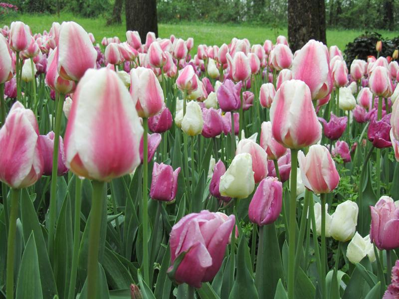 Nei grandi prati sono state create aiuole di tulipani dalle forme morbide, progettate ponendo particolare attenzione a non alterare l’impianto storico e prospettico.
